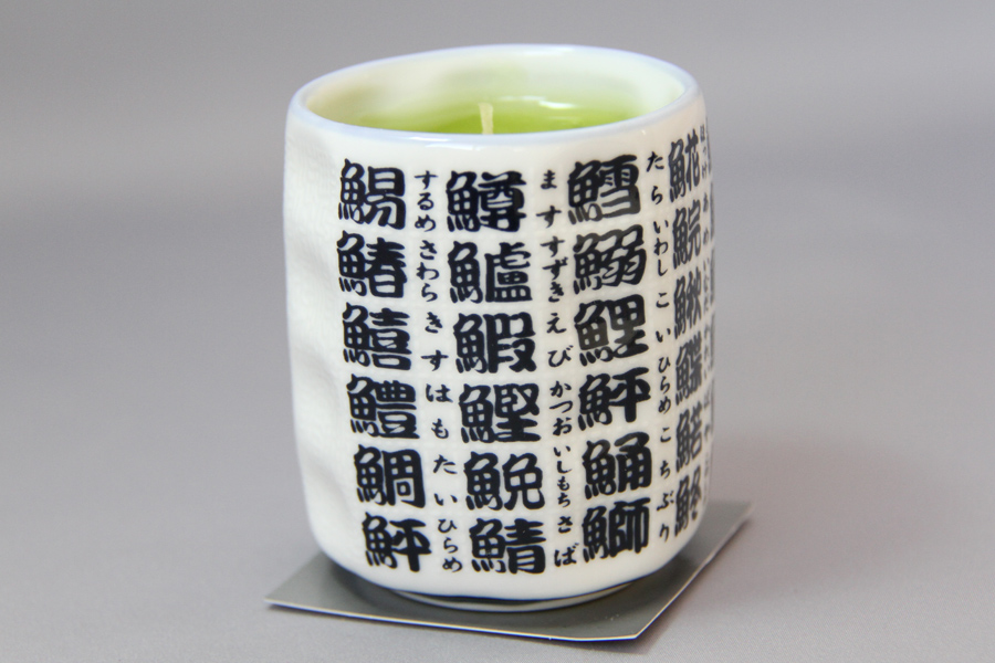 お寿司屋さんの湯呑みです。魚へんの漢字が全部で48文字書かれています。