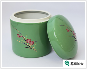 青磁にランの絵柄をあしらった、上品なデザインのお骨壺です。